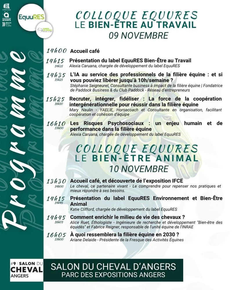 Le label EquuRES, en partenariat avec le Conseil des Équidés Pays de la Loire, Destination Angers et la région Pays de la Loire, organise un colloque gratuit au Salon du Cheval à Angers. Cet événement, intitulé « Le bien-être au travail et le bien-être animal : enjeux et perspectives », se tiendra les 9 et 10 novembre 2025 au Parc des Expositions d’Angers.